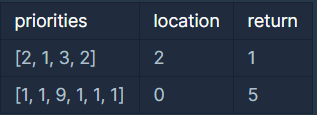 인쇄 대기목록이 priorities라는 이름으로 주어집니다. 여기에 location이 주어지는데요.