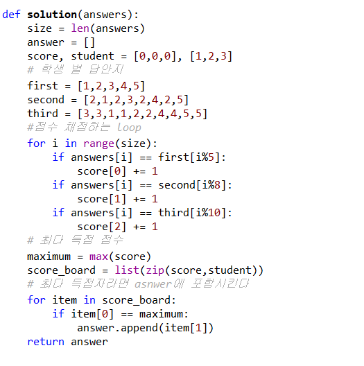 1번 문제부터 마지막 문제까지의 정답이 순서대로 들은 배열 answers가 주어졌을 때, 가장 많은 문제를 맞힌 사람이 누구인지 배열에 담아 return 하도록 solution 함수를 작성해주세요.
